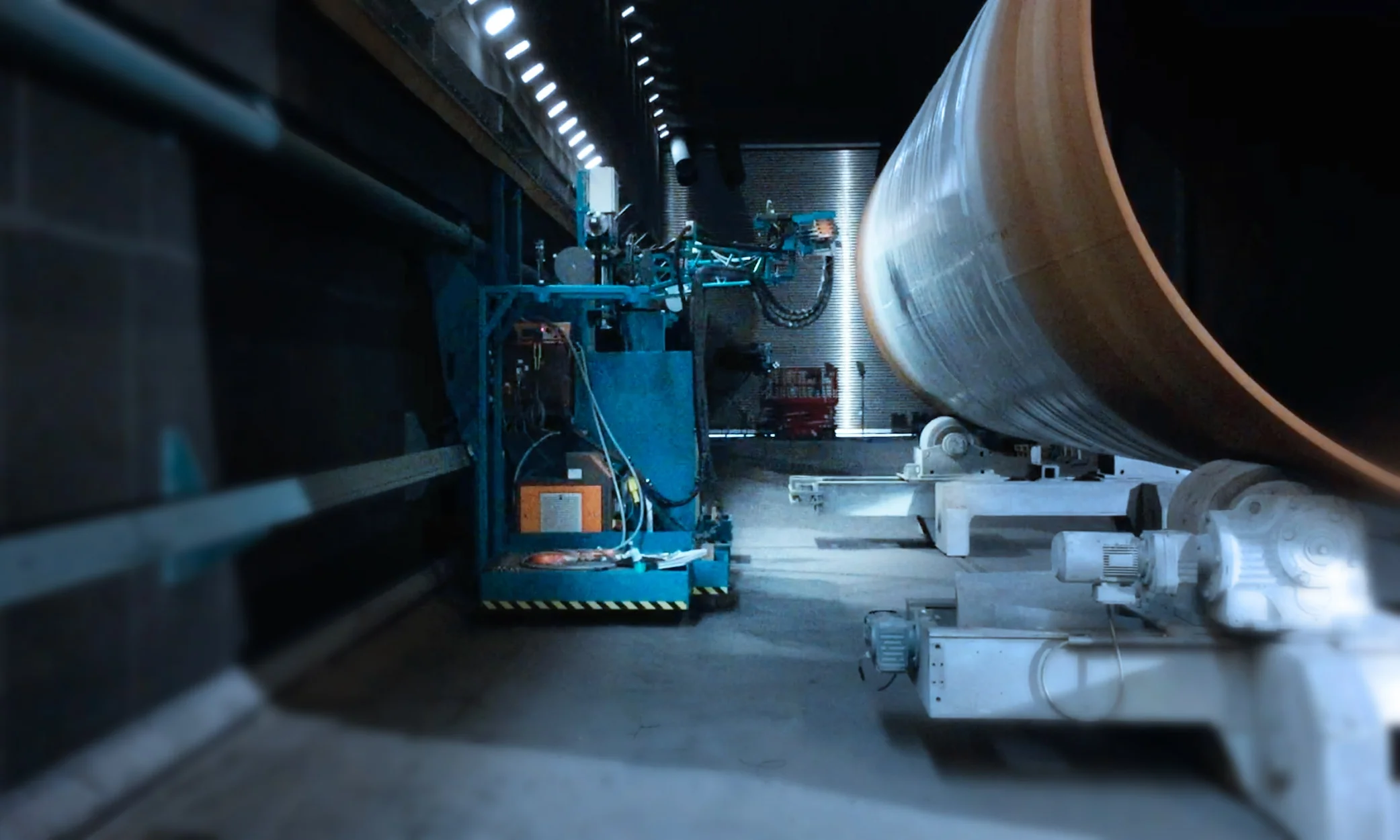 Robot system developed to arc spray the outside surface of wind turbine towers.